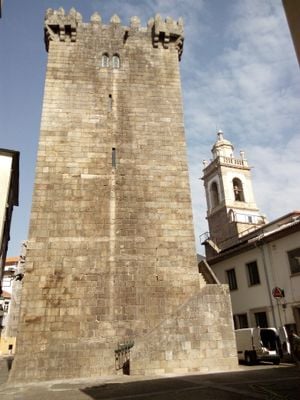 El Castillo de Braga presenta una torre del homenaje de granito de treinta metros con almenas biseladas en el centro histórico.