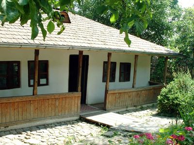 La pequeña vivienda contiene dos habitaciones principales separadas por un pasillo central, con elementos arquitectónicos rumanos tradicionales del siglo XIX.