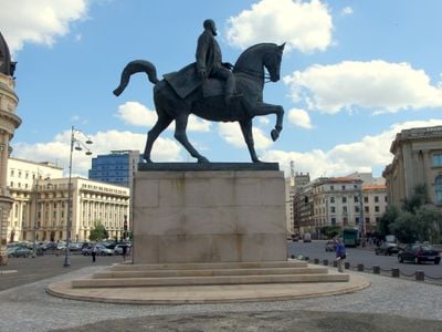La estatua de 13 metros representa al Rey Carol I montado a caballo, situada en el área central de Bucarest sobre Calea Victoriei.