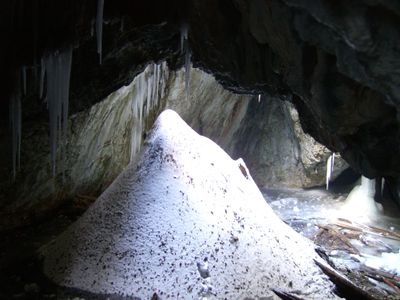 La Cueva Focul Viu contiene dos salas principales, donde la cámara más grande presenta un bloque de hielo sustancial iluminado por luz natural.