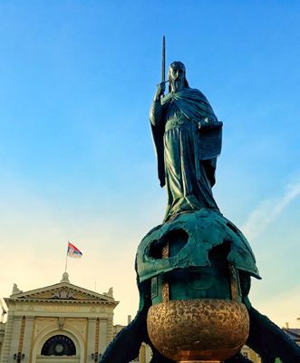 El Monumento a Stefan Nemanja alcanza una altura de 23.5 metros y representa al gobernante medieval sosteniendo una espada y la carta de Hilandar.