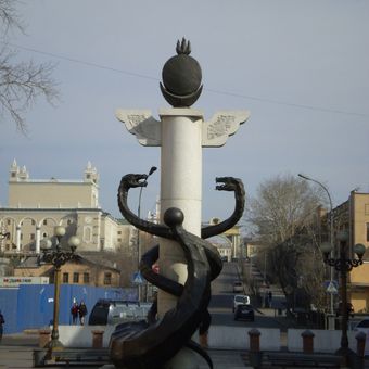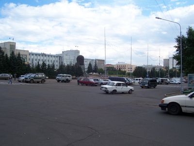 La plaza central presenta una escultura de bronce de la cabeza de Lenin de 42 toneladas, que mide 7,7 metros de altura sobre una base de 4,5 metros.