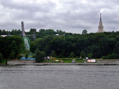 El edificio principal de la Universidad Estatal de Moscú corona la colina desde 1953, representando una de las Siete Hermanas del período estalinista.