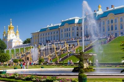 El Palacio Grande de Peterhof se extiende a lo largo de una terraza casi 300 metros, conectando el Jardín Superior con el Parque Inferior. La estructura cuenta con múltiples alas ornamentadas y salones llenos de pinturas, esculturas y detalles dorados.