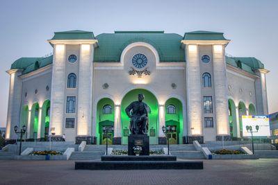 El teatro se encuentra en el antiguo emplazamiento de la Catedral de la Resurrección y presenta un monumento de bronce de Majit Gafuri.