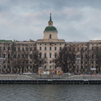 El Orfanato de Moscú es un complejo extenso con características neoclásicas que se extiende a lo largo del río Moskva, caracterizado por detalles arquitectónicos intrincados y trabajo de piedra ornamental. Un belvedere con torres cerca del terraplén sirve como punto focal distintivo de la propiedad.
