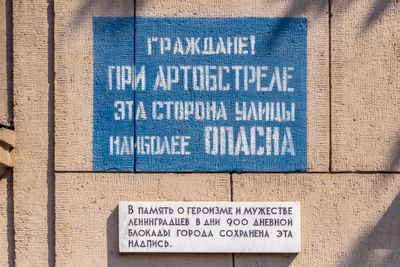 Este mensaje de advertencia representa una de las varias inscripciones auténticas de la época del asedio conservadas en San Petersburgo como memoriales públicos.