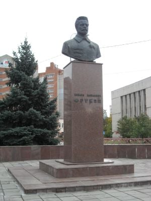 Este memorial representa uno de varios monumentos en Rusia dedicados a Frunze, quien falleció misteriosamente durante un procedimiento médico.