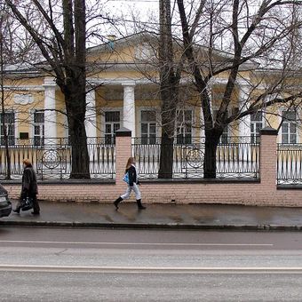 La calle Ostozhenka corre por el centro de Moscú con edificios del siglo XIX tardío junto a estructuras modernas en ambos lados. La mezcla de mansiones antiguas y construcciones contemporáneas crea una calle variada.