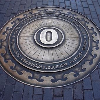 El marcador del kilómetro cero se encuentra en el centro de Ufa, señalando el punto inicial para medir distancias en la red de carreteras de Bashkortostán.