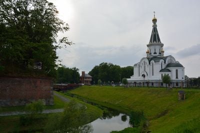 La iglesia ortodoxa de San Alejandro Nevski es un edificio con cinco cúpulas blancas y una torre central alta, diseñado por A.B. Musin en estilo de cúpula de tienda. La estructura se ubica en una zona histórica marcada por fortificaciones militares cercanas que una vez defendieron la ciudad.