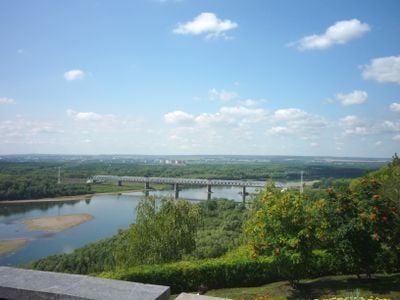 El Puente Ferroviario de Ufa se extiende 655.5 metros sobre el río Belaya con seis tramos de construcción de acero, cada uno de 109.25 metros.