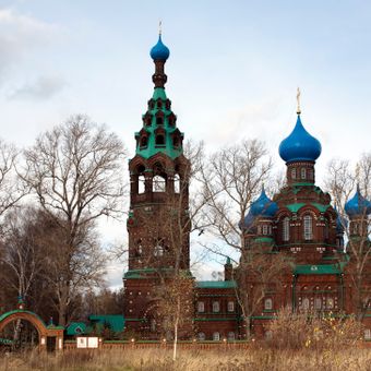 La iglesia de ladrillo rojo presenta cúpulas azules y dos altares laterales dedicados a San Nicolás y San Sergio de Radonezh junto al altar principal.