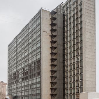 Рельеф-эмблема на фасаде Центрального экономико-математического института (Черёмушки)