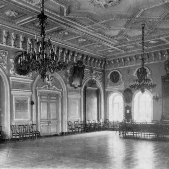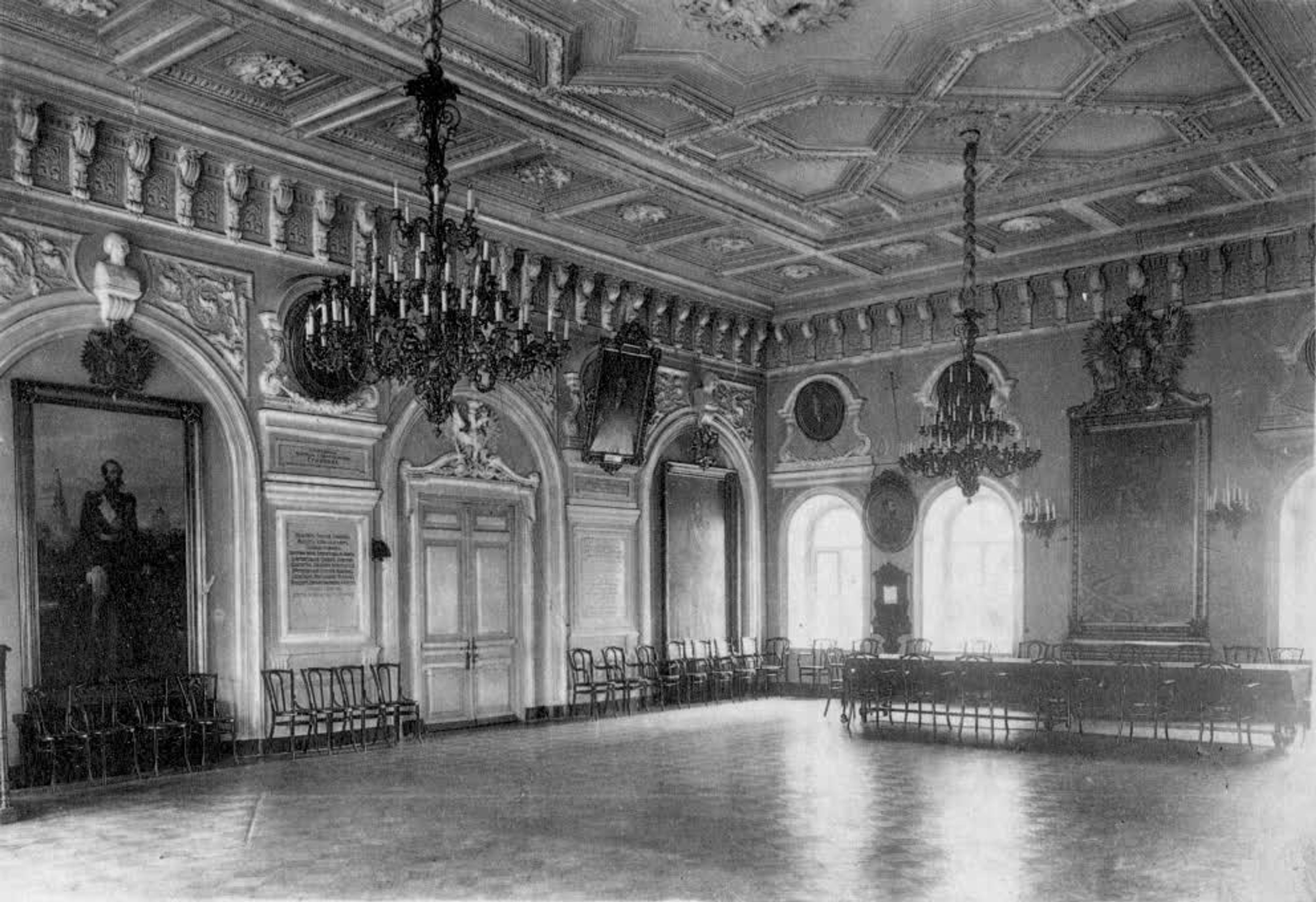 El salón principal del instituto presenta detalles arquitectónicos específicos documentados en el Diccionario Enciclopédico Brockhaus y Efron.