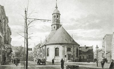 La Iglesia Lituana presenta muros de ladrillo rojo con detalles en piedra caliza blanca y una torre octagonal que se eleva sobre la base cuadrangular.