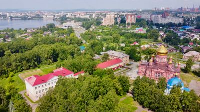 El Monasterio Skorbyashchensky es un complejo religioso que comprende varios edificios con cupulas caracteristicas y fachadas ornamentadas. El sitio contiene espacios para servicios religiosos con iconostasis elaboradas y areas de jardin distribuidas en los terrenos.