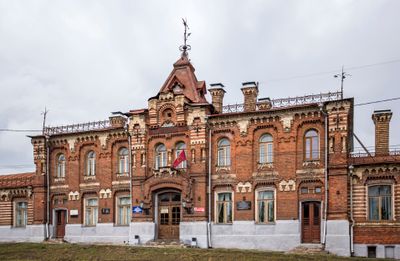 El edificio muestra características típicas del Renacimiento Ruso con ventanas ornamentales y patrones decorativos que reflejan la artesanía del siglo 19. Estos elementos de diseño son claramente visibles en la fachada de ladrillo rojo y dan forma al carácter de la calle.
