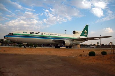 Un Lockheed L-1011 Tristar con librea de Saudia marca la entrada, mientras un Douglas DC-3 representa el regalo de Roosevelt al Rey Ibn Saud.
