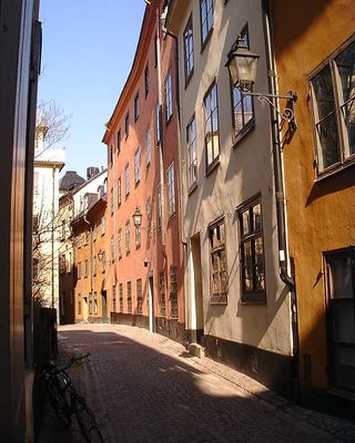 Baggensgatan se extiende desde Bollhusgränd cerca de la plaza Köpmantorget hacia el sur del distrito medieval de Estocolmo, con edificios históricos y caminos empedrados.