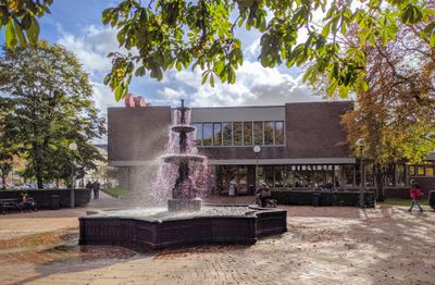 El edificio de la biblioteca municipal fue diseñado por el arquitecto Jörgen Michelsen y representa la infraestructura educativa pública sueca.