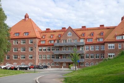 El edificio principal del Hospital Renströmska se eleva sobre un terreno elevado con un diseño simétrico y numerosas ventanas en su fachada.