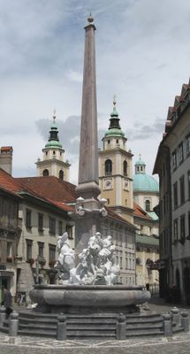 La Fuente de Robba presenta tres figuras masculinas con jarras, que representan los dioses de los ríos Ljubljanica, Sava y Krka.