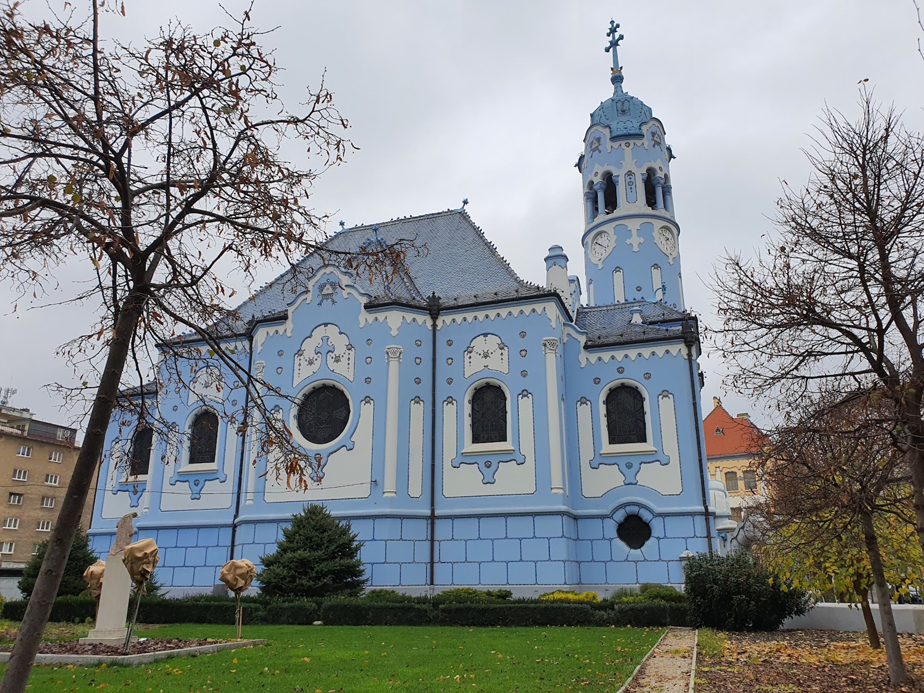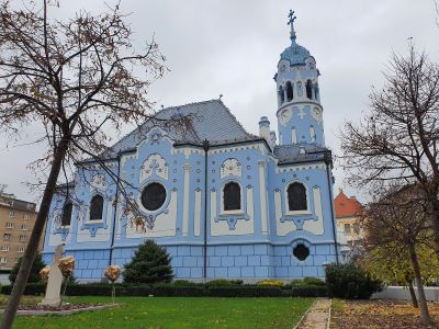 El arquitecto Ödön Lechner terminó este edificio religioso en 1913, incorporando elementos de diseño de la Secesión húngara en la composición y ornamentación.