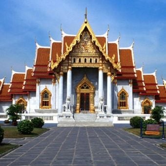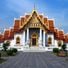 Wat Benchamabophit es un templo budista en el distrito de Dusit de Bangkok, Tailandia, construido con paredes y columnas de mármol blanco de Carrara importado de Italia. El material europeo se combina con el techo curvo y los ornamentos dorados del diseño tradicional tailandés.