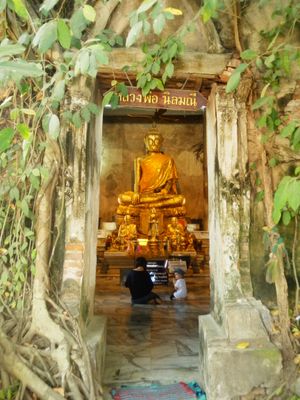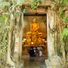 El santuario principal de Wat Bang Kung se mantiene en pie con sus paredes y techo completamente cubiertos por raíces y ramas de árboles banyan.