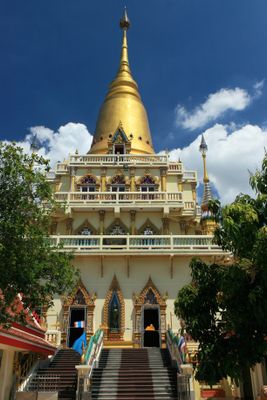 El templo presenta múltiples estructuras con elementos arquitectónicos tailandeses tradicionales, incluyendo una estupa central, ornamentos dorados y decoraciones murales detalladas.
