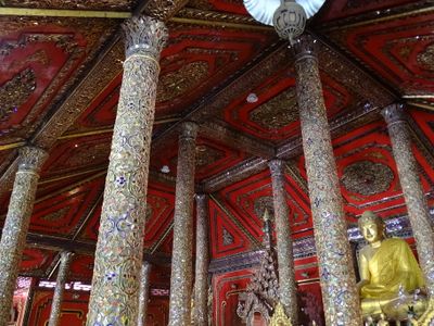 El templo presenta varios niveles de tejados y columnas de teca decoradas con mosaicos de vidrio, exhibiendo elementos arquitectónicos tradicionales.