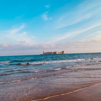 Kızkalesi es una fortaleza medieval preservada construida sobre una isla pequeña situada aproximadamente a 200 metros de la costa en el mar Mediterráneo, con muros de piedra, ocho bastiones de formas variadas y dos puertas de entrada que permiten el acceso a patios internos y estructuras históricas.