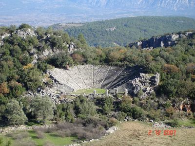 Los restos arqueológicos incluyen inscripciones griegas y licias, templos, teatros, un odeón y cientos de tumbas con forma de casa talladas en roca.
