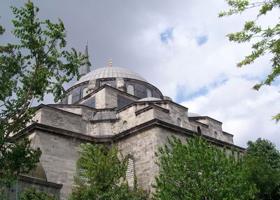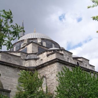 Dos cúpulas más pequeñas flanquean la cúpula central principal, creando una composición arquitectónica que ejemplifica el diseño temprano de mezquitas otomanas.