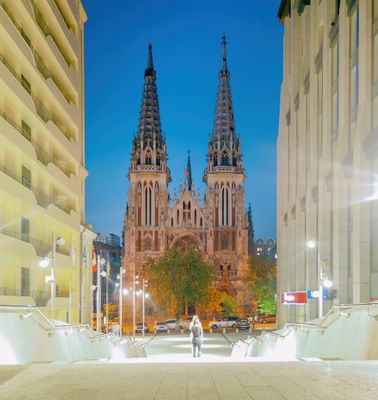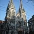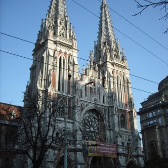 La iglesia presenta dos torres delgadas con agujas puntiagudas, grandes vidrieras y detalladas tallas en piedra en sus muros exteriores de ladrillo.