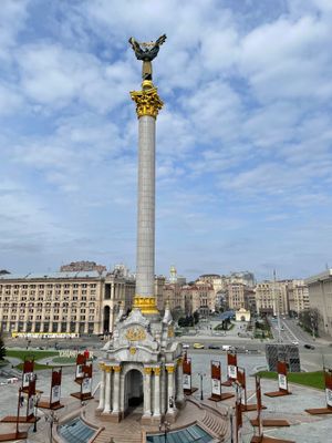 El Monumento a la Independencia se eleva 61 metros con una columna de mármol blanco coronada por una estatua de Berehynia.