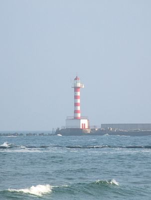 La estructura presenta un patrón distintivo de franjas horizontales rojas y blancas, señalando su posición cerca de la entrada del estuario Sukhy.