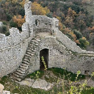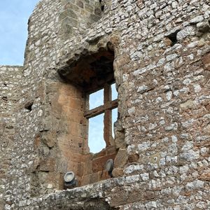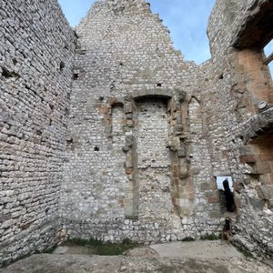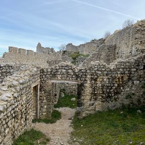 Las ruinas del castillo muestran la arquitectura defensiva medieval mediante elementos como murallas fortificadas, una torre del homenaje y estructuras militares de diferentes períodos.