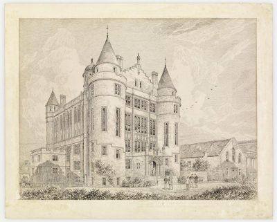 La construcción de Teviot Row House comenzó en 1887 con un presupuesto de 15.600 libras y finalizó en octubre de 1889 bajo el arquitecto Sydney Mitchell.