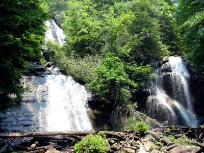 Anna Ruby Falls presenta dos arroyos separados, Curtis Creek y York Creek, que convergen para crear una espectacular cascada doble de 150 pies dentro del Bosque Nacional Chattahoochee-Oconee.