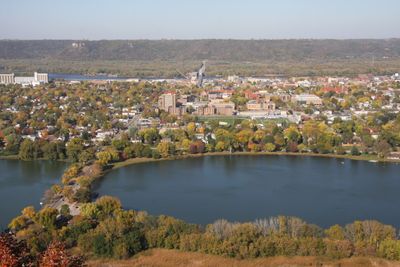 Winona se extiende a lo largo del río Mississippi, entre acantilados de arenisca y agua, con Sugar Loaf como su formación natural destacada.