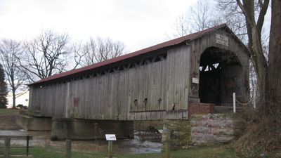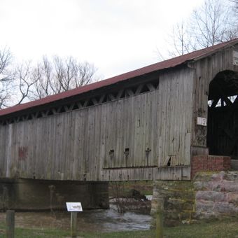 Entre los últimos puentes cubiertos que quedan en el noroeste de Ohio, esta estructura incluye contrafuertes de piedra, revestimiento vertical de madera y techo metálico.
