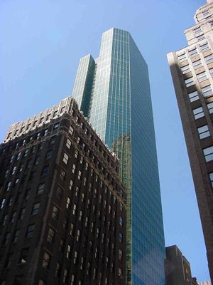 Tower 49 es un edificio de oficinas moderno en Midtown Manhattan con 45 plantas revestidas de vidrio espejo azulado y formas geometricas angulares. La estructura se eleva aproximadamente 187 metros y presenta una apariencia distintiva en el paisaje urbano.