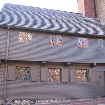 La Paul Revere House es una residencia del siglo XVII en el North End de Boston que ahora funciona como museo. La estructura de madera muestra un segundo piso saliente, ventanas pequeñas con vidrios en forma de rombo y un techo inclinado típico de la construcción hacia 1680.
