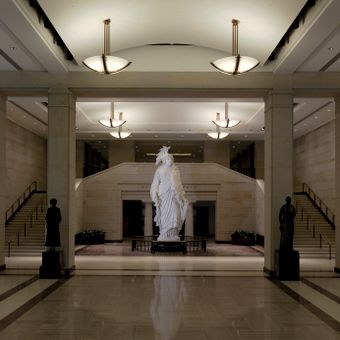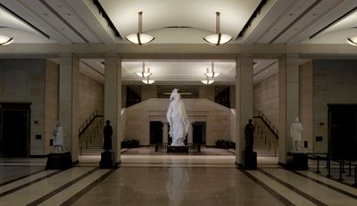 El Salón de la Emancipación, espacio central, exhibe una réplica en yeso de la Estatua de la Libertad que corona la cúpula del Capitolio.