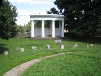 El cementerio ocupa un acre de terreno y contiene cuarenta y una lápidas de mármol dispuestas en círculo alrededor de un mástil central.