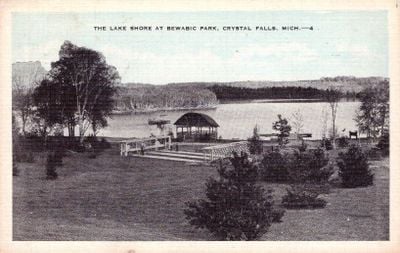 El Parque Estatal Bewabic abarca 127 hectáreas con playa arenosa, zonas de camping y senderos rodeados de densos bosques junto al lago Fortune.