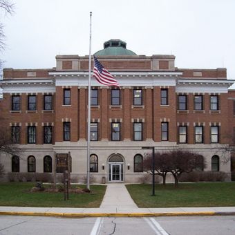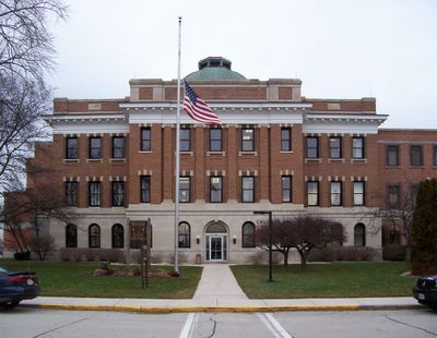 El Palacio de Justicia del Condado de Calumet presenta una cúpula de cobre y construcción de ladrillo rojo con bloques de concreto en tres pisos.