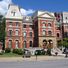 El edificio de ladrillo de tres pisos presenta un tejado mansarda, chimeneas ornamentadas y un pabellón central con pilastras que sostienen un pórtico clásico.